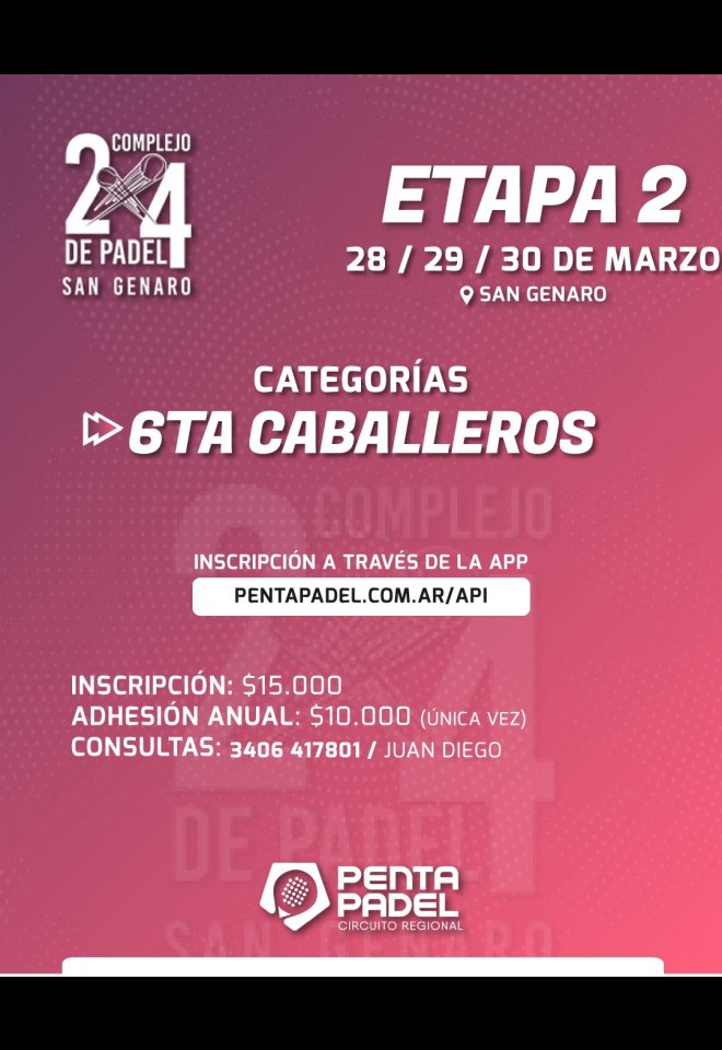 »» Evento: 6TA CAB / 28-29-30 MARZO / 2X4 PADEL / ETAPA 2 »» Localidad: San Genaro »» Fechas: 28/03/2025 al 30/03/2025