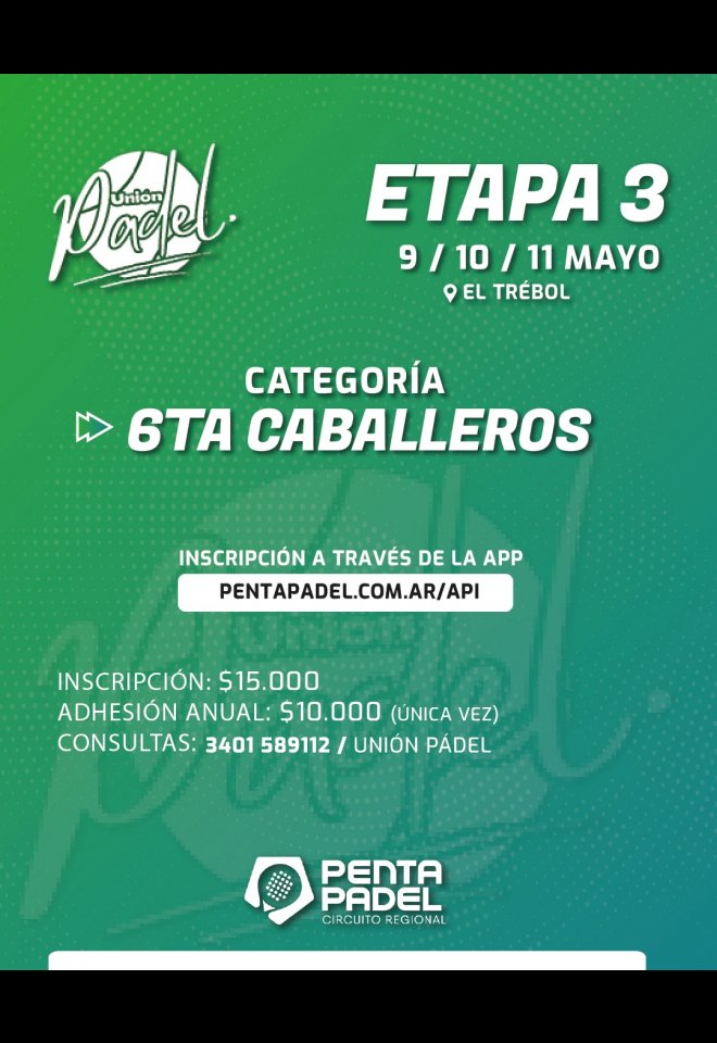 »» Evento: 6TA CAB / 9-10-11 MAYO / UNION PADEL / ETAPA 3 »» Localidad: El Trébol »» Fechas: 08/05/2025 al 11/05/2025