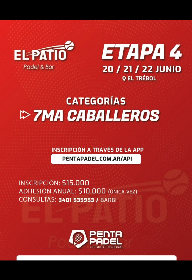 »» Evento: 7MA CAB / 20-21-22 JUNIO / EL PATIO PADEL / ETAPA 4 »» Localidad: El Trébol »» Fechas: 20/06/2025 al 22/06/2025