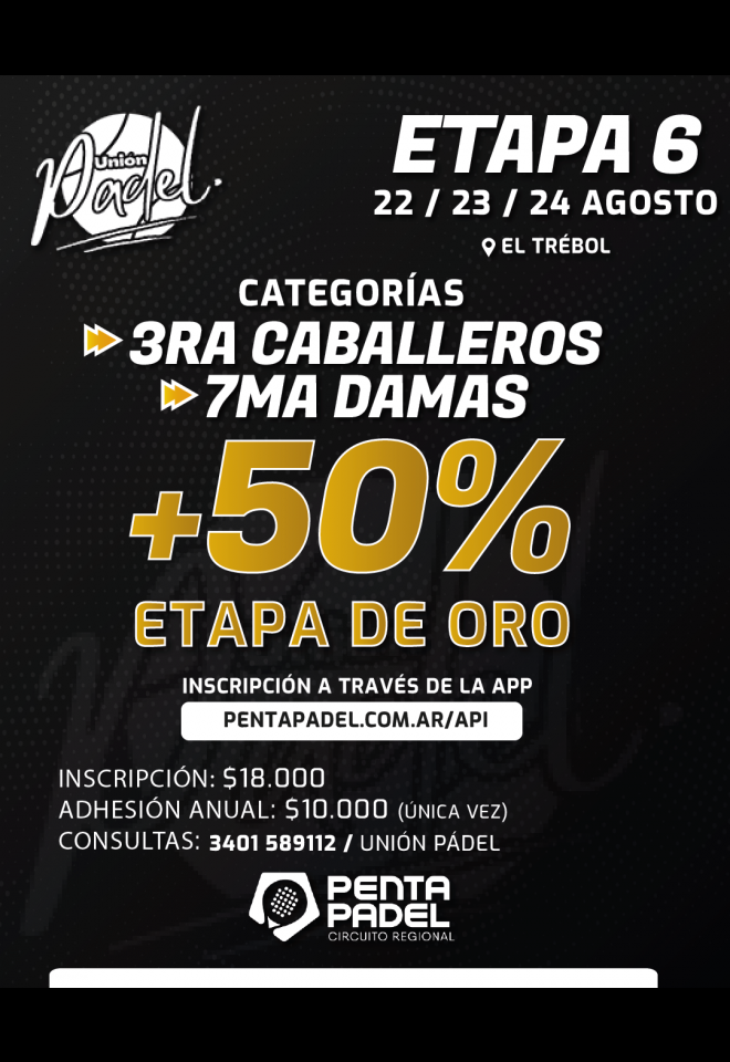 »» Evento: 3RA CAB - 7MA DAM / UNION PADEL / 22-23-24 AGOSTO / ETAPA DE ORO »» Localidad: El Trébol »» Fechas: 22/08/2025 al 24/08/2025